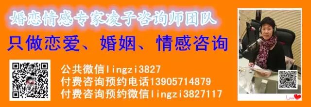 杭州文广凌子婚恋咨询工作室,专业从事恋爱择偶、夫妻情感、亲子关系、离婚、复婚等方面的咨询,特别对一些疑难情感问题有独特的解决办法。 关注公共微信号lingzi3827获得免费咨询回复,一对一付费个案咨询预约微信lingzi3828。预约QQ379805413 。